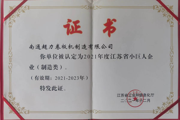 卷板機 >> 新聞中心 >> 超力卷板機獲2021-2023年度江蘇省小巨人企業證書
